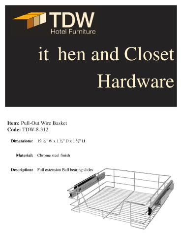 Kitchen and Closet Hardware Item: Pull-Out Wire Basket Code: TDW-8-312 Dimensions: 19 ½” W x 1 ½” D x 1 ½” H Material: Chrome steel finish Description: Full extension Ball bearing slides