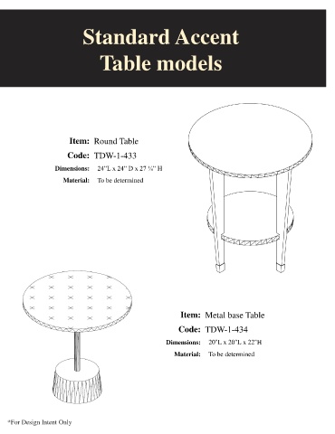 Standard Accent Table models Item: Round Table Code: TDW-1-433 Dimensions: 24”L x 24” D x 27 ¼” H Material: To be determined Item: Metal base Table Code: TDW-1-434 Dimensions: 20"L x 20"L x 22"H Material: To be determined *For Design Intent Only