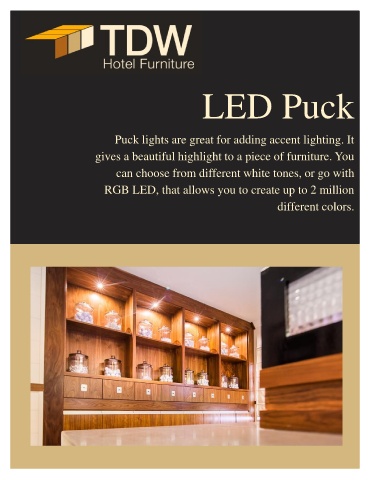 LED Puck Puck lights are great for adding accent lighting. It gives a beautiful highlight to a piece of furniture. You can choose from different white tones, or go with RGB LED, that allows you to create up to 2 million different colors.