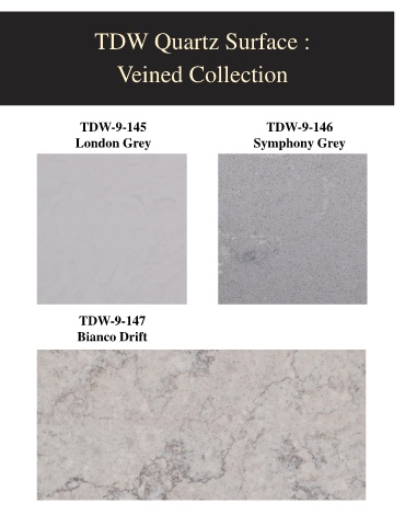 TDW Quartz Surface : Veined Collection TDW-9-145 TDW-9-146 London Grey Symphony Grey D8108 D8512 TDW-9-147 Bianco Drift D8301