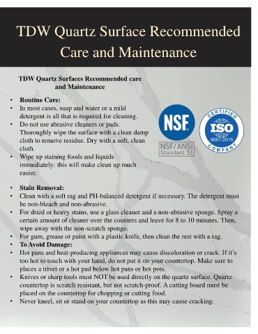 • Knives or sharp tools must NOT be used directly on the quartz surface. Quartz
